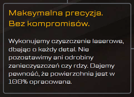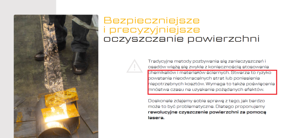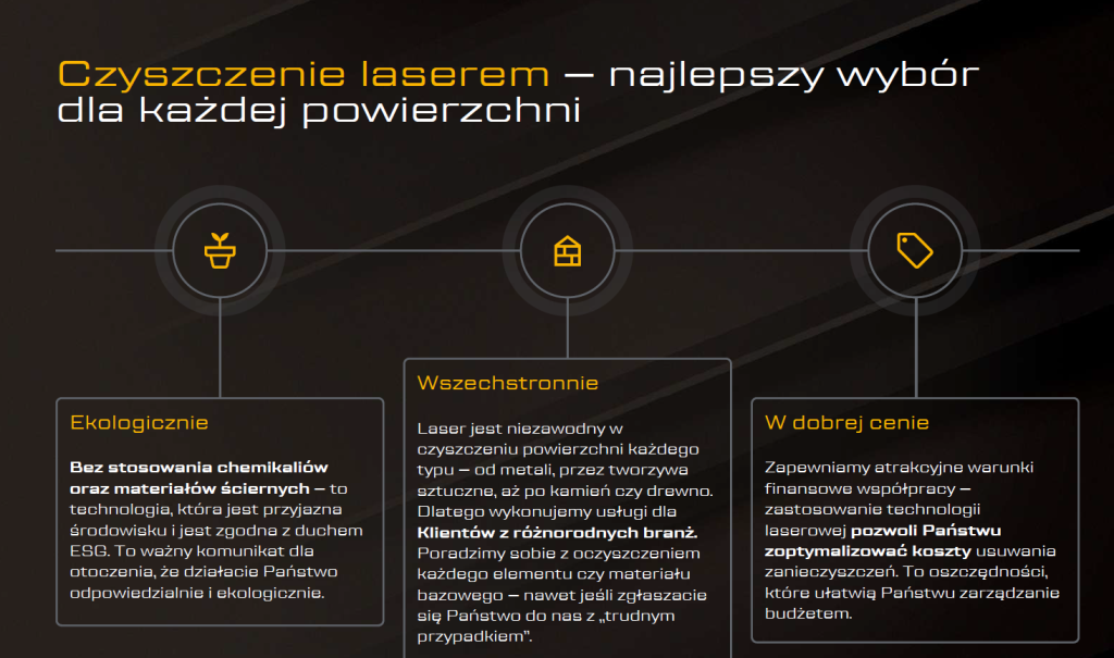 Zalety czyszczenia laserowego zostały poparte korzyściami dla odbiorcy – po to, aby miał on świadomość przewagi tego rozwiązania nad tradycyjną metodą.
