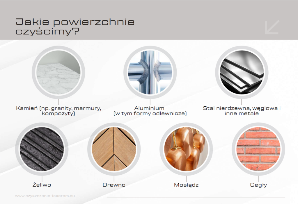 Aby rozwiać wszelkie wątpliwości i pokazać szeroki zakres zastosowania technologii, wypunktowaliśmy materiały i powierzchnie, które można bezpiecznie czyścić – od metalu i kamienia, po delikatne elementy zabytkowe. Wszystko w formie graficznej, dla jeszcze lepszego zobrazowania i łatwiejszego zapamiętania.