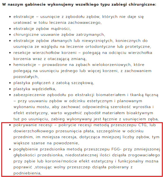 Jak to poprawić? W treści zamieść np. FAQ (odpowiedzi na najczęściej zadawane pytania), przedstaw cennik (a jeśli znajduje się oddzielna zakładka, przekieruj to niej), opis „krok po kroku” jak przebiega wizyta / zabieg.