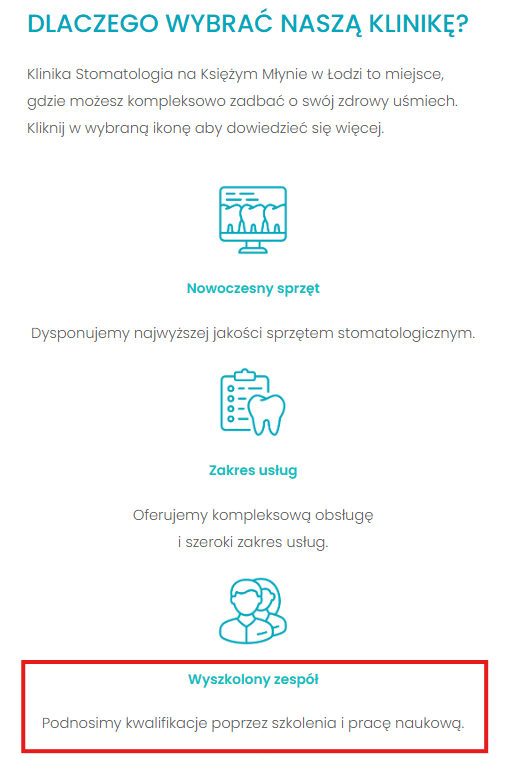 Jak to poprawić? Najprostszy sposób to przedstawienie zespołu (wraz z krótką informacją o doświadczeniu i kwalifikacjach potwierdzonych certyfikatami), pokazanie rzeczywistych zdjęć gabinetów. O ile to możliwe, umieść opinie pacjentów czy nawet zdjęcia „przed” i „po” (tutaj jednak musisz zachować ostrożność, aby nie zostało to uznane jako działanie sprzeczne np. z zakazem reklamy wyrobów medycznych przeznaczonych dla laików).