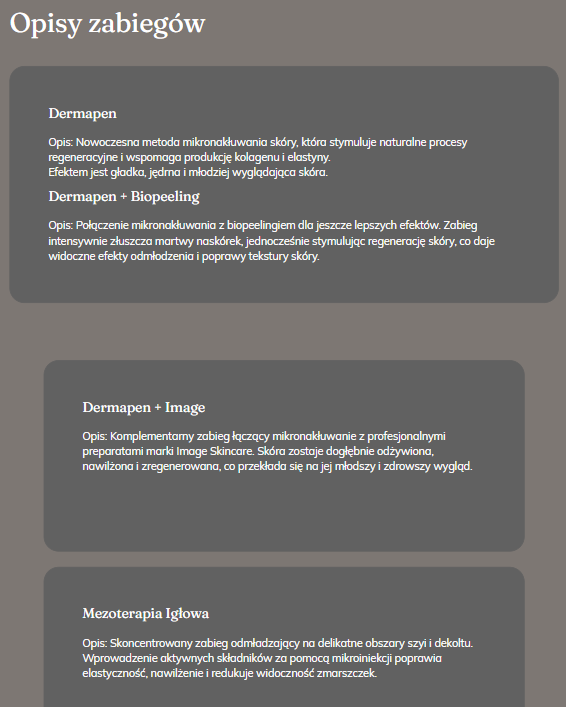 Zamiast ograniczać się do ogólnego opisu zabiegów, dopisz szczegóły. Wyjaśnij przebieg krok po kroku, napisz o wskazaniach i przeciwwskazaniach, cenach, płatnościach itp. Zastanów się, czego pacjent chciałby się dowiedzieć (np. na podstawie telefonów do rejestracji) i stwórz listę odpowiedzi na najczęściej zadawane pytania.